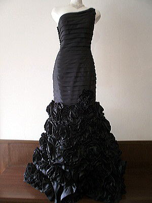 ワンショルダーの縦長効果ですらりとしたシルエットのドレス。ドレス裾に広がるバラの花々が豪華で華やかです。