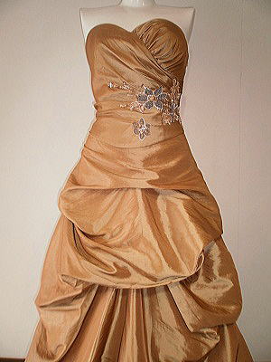 とても上品なゴールドドレスです。スカート部分をランダムにつまんでいて、長さを調整しやすいので、身長に関係なく着こなすことが出来ます。〒596-0823