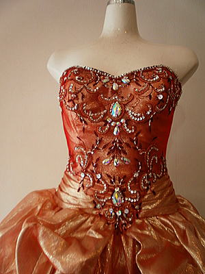 赤金(REDGOLD)の光沢が眩い豪華なボリュームドレスです。